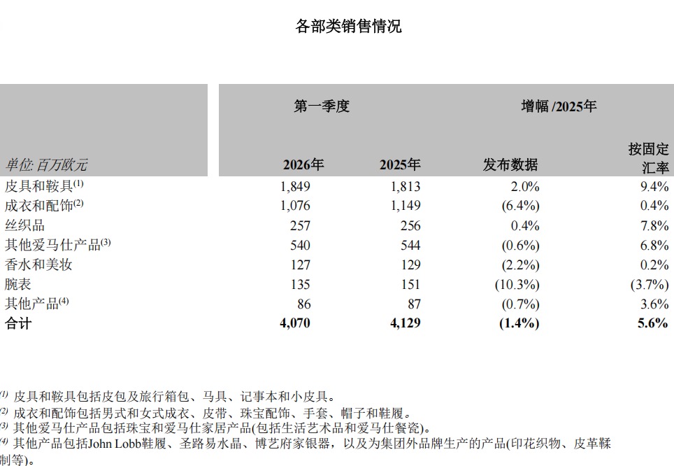 从业务板块看,核心皮具与马具部门按固定汇率增长9.4%至18.5亿欧元,仍是增长引擎;成衣与配饰部门仅增长0.4%,腕表继续承压下滑3.7%。区域市场中,包含中东在内的其他地区销售额同比下滑5.9%,仅为1.6亿欧元,中东局势对集团一季度整体增长造成了约1.5个百分点的拖累。其中,阿拉伯联合酋长国,以及科威特、卡塔尔和巴林所受影响尤为明显。