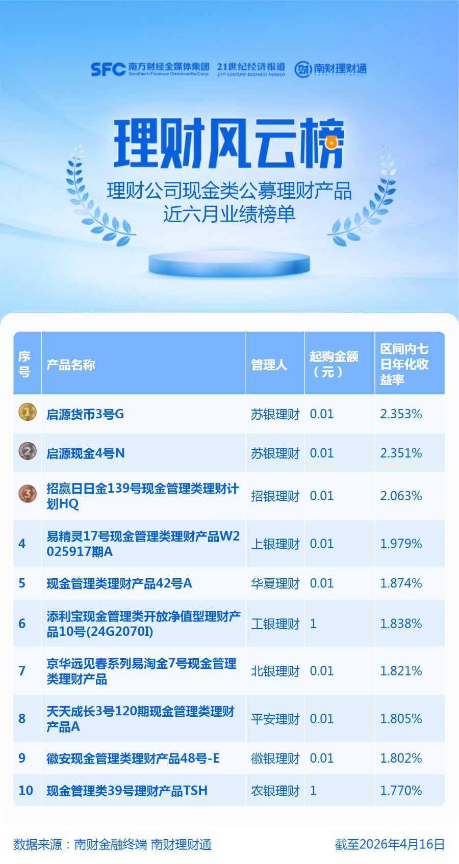 产品统计范围为理财公司发行的公募现金类产品,统计截止日期为2026年4月16日,统计区间为近六个月。