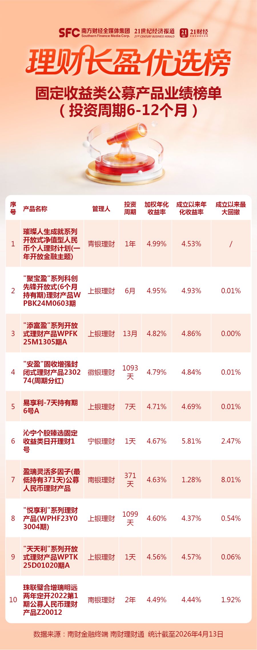 本期榜单统计对象为城商行理财公司发行的成立满1年的公募固定收益类产品,投资周期为6—12个月(含)期限,同系列同投资周期产品保留一只,加权年化收益率计算方式为“5%*近1月年化收益率+10%*近3月年化收益率+15*%近6月年化收益率+30%*近1年年化收益率+40%*成立以来年化收益率”,排名依据为加权年化收益率,数据计算截止时间为2026年4月13日。