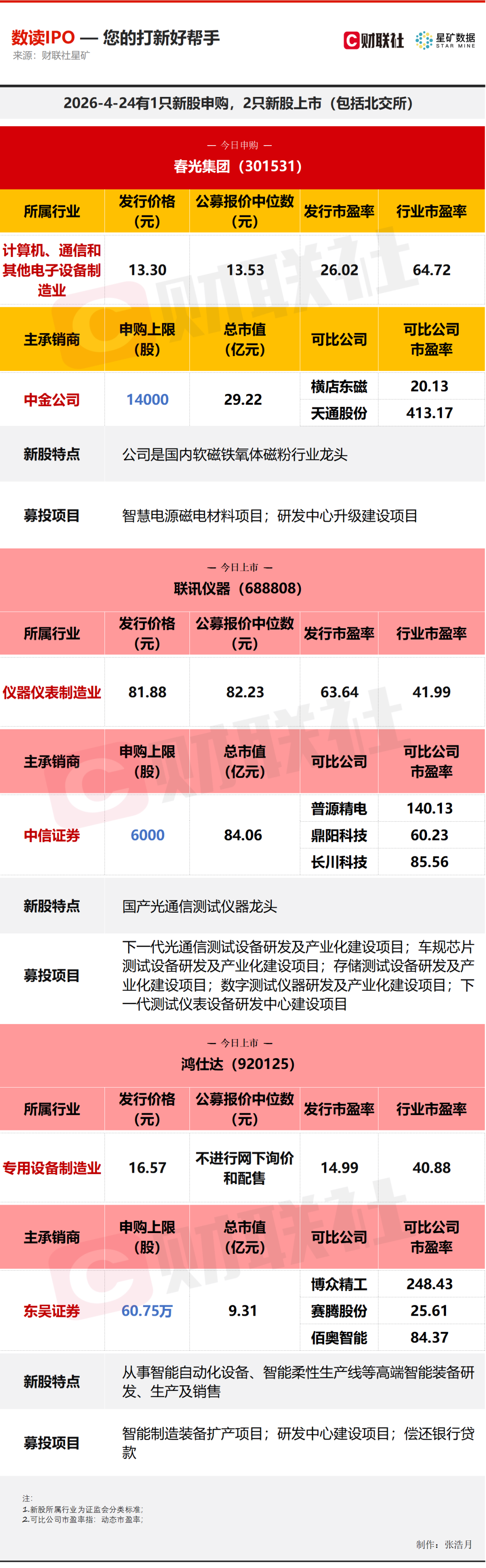 今日有1只新股申购,为创业板的春光集团;2只新股上市,分别为科创板的联讯仪器,北交所的鸿仕达。