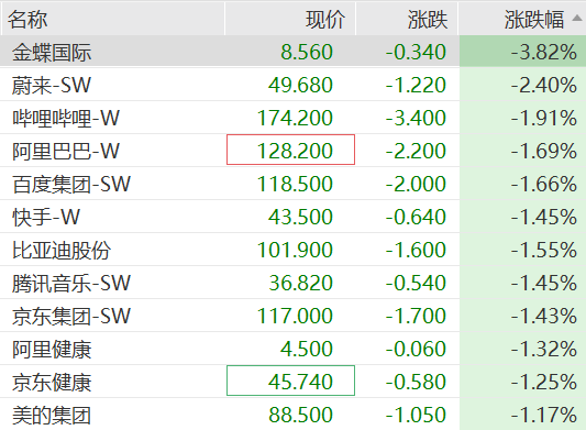 港股开盘,恒生指数跌0.70%,恒生科技指数跌0.80%。科网股普跌,金蝶国际跌近4%,蔚来跌超2%,哔哩哔哩、阿里巴巴、百度、快手等跌超1%。