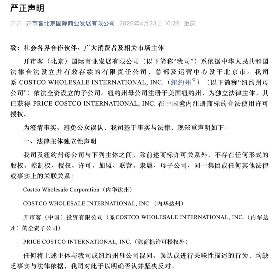 声明指出,开市客(北京)国际商业发展有限公司(以下称“开市客北京公司”)与开市客(中国)投资有限公司(即当前国内开市客门店运营方),不存在任何形式的股权、控制权、授权、许可、加盟、联营、隶属、母子公司、同一集团或任何其他法律或事实上的关联关系。