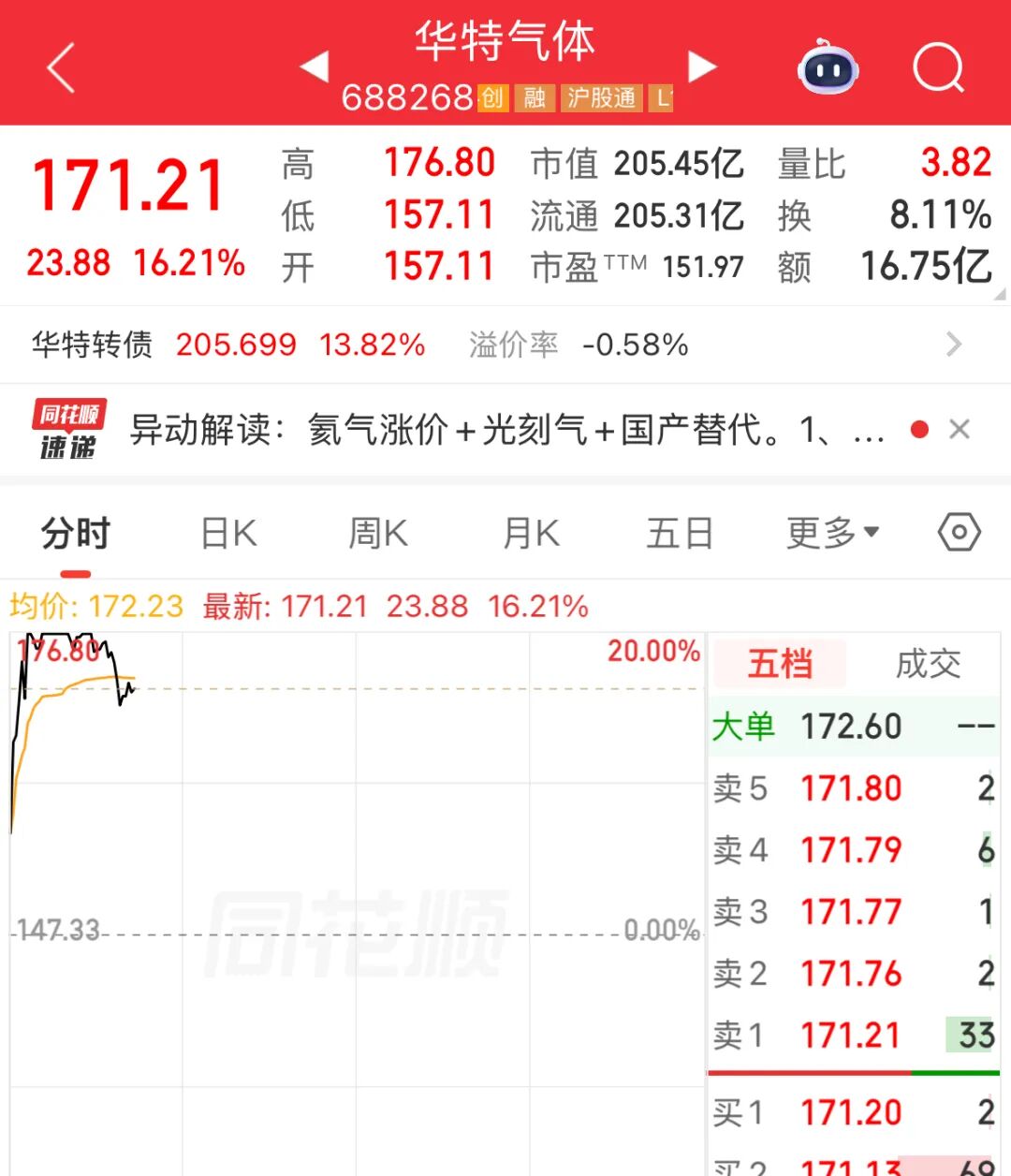早盘,电子化学品板块活跃。华特气体(688268) 盘中触及“ 20cm ” 涨停创历史新高,截至发稿涨超16%。金宏气体、宏昌电子、中船特气等多股跟涨。