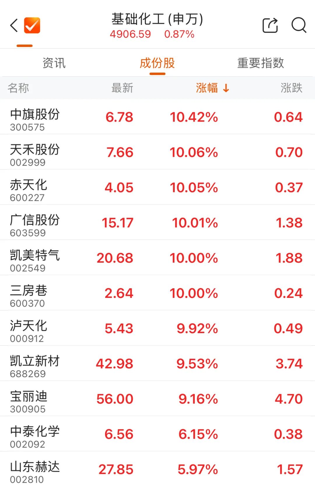 此外,化工板块盘中震荡拉升。天禾股份、赤天化、广信股份、凯美特气等多股涨停,凯立新材、宝丽迪、中泰化学等涨幅居前。
