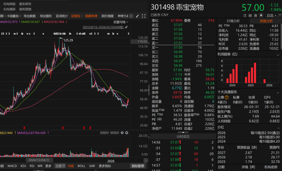 从乖宝宠物的市场走势看,其股价在2025年10月下旬急跌后趋于盘整,今年1月下旬以来再度大跌,股价从1月份的70多元跌至4月中旬的50元下方。