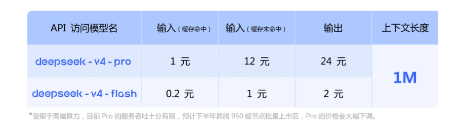 并且,生态成本能够进一步降低。DeepSeek在价格表中特别提到:“受限于高端算力,目前DeepSeek-V4-Pro的服务吞吐十分有限,预计下半年昇腾950超节点批量上市后,Pro的价格会大幅下调。”