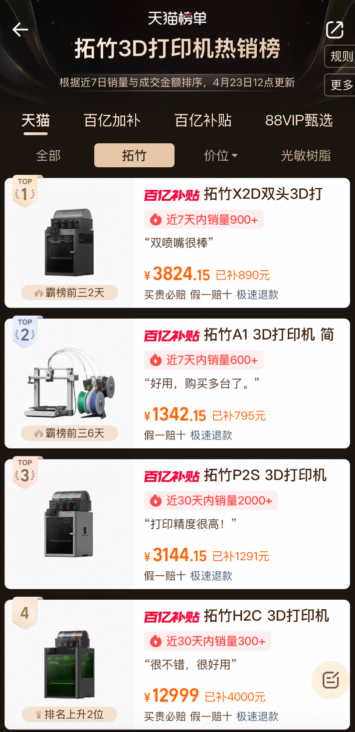 以旗下热门产品拓竹X2D 3D打印机为例,该产品在某购物平台上的补贴后价格为3824元左右;在其热销榜单中,排名前四位的产品中价格最低的一款售价约为1342元,与平价赛道形成完全区隔。