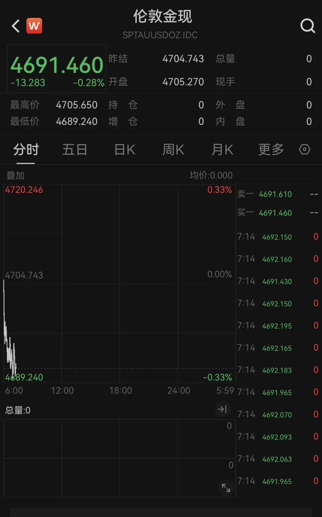 24日,现货黄金震荡下挫,盘中再度跌破4700美元/盎司关口,跌超0.28%。
