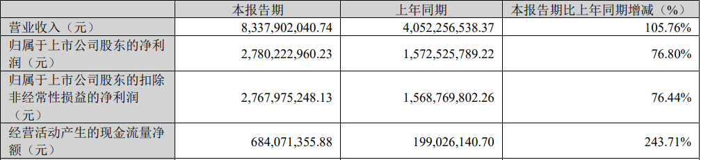 归母净利润27.80亿元,同比增长76.80%; 但 环比2025年第四季度的32.05亿元下降13.25%, 扣非净利润27.68亿元,同比增长76.44%。