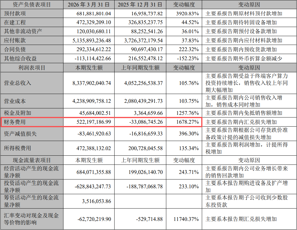 财报显示, 财务费用激增是拖累Q1利润率的核心因素。 一季度公司财务费用达5.22亿元,而2025年同期为-0.33亿元,环比、同比均大幅增长,主要系报告期内汇兑损失增加。