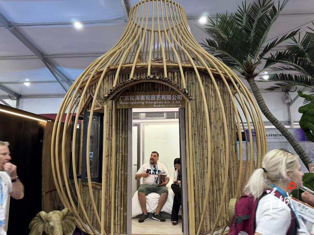 类似的逻辑,也体现在以园艺起家的广东松涛景观园艺有限公司身上。销售经理申余凤介绍,公司最初做园艺,近年因文旅产业兴起,拓展出艺术民宿产品线。展位上,一座以仿真竹子和真竹子混搭而成的集成房格外吸睛。“我们老板是工艺美术师,产品充满艺术感,很适合景区造景。”记者了解到,该集成房内部的尺寸、造型、内部配置均可定制。“我们不只是提供一棵树、一片草,而是交付一个可运营的文旅空间。”申余凤如是说。
