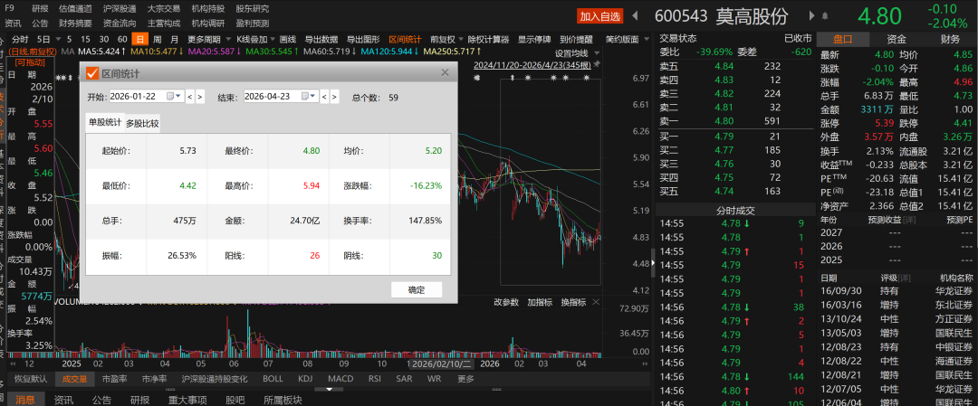 二级市场方面,Choice数据显示,莫高股份股价自1月22日以来持续震荡走低,其间累计跌幅超过16%,目前市值为15.41亿元。