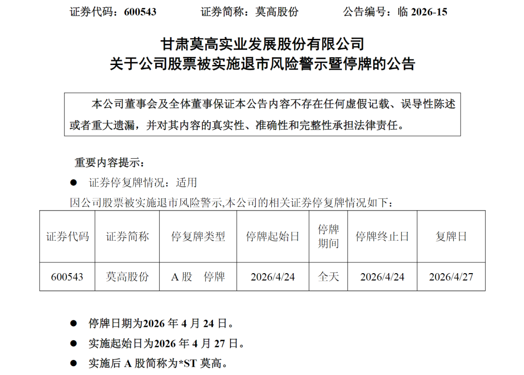 根据《股票上市规则》相关规定,莫高股份股票将于2026年4月24日停牌1天,自2026年4月27日开市起复牌并实施退市风险警示。实施退市风险警示后,公司股票将在风险警示板交易,股票价格的日涨跌幅限制为5%。