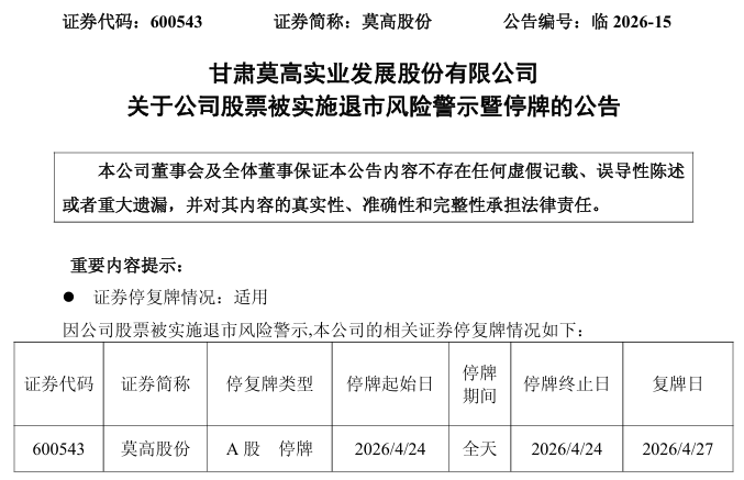 公司股票将于4月24日停牌1天,自4月27日开市起复牌并实施退市风险警示,股票简称由“莫高股份”变更为“*ST莫高”,日涨跌幅限制为5%。若公司2026年度继续触及终止上市情形,股票将被上交所决定终止上市。