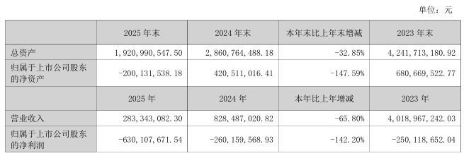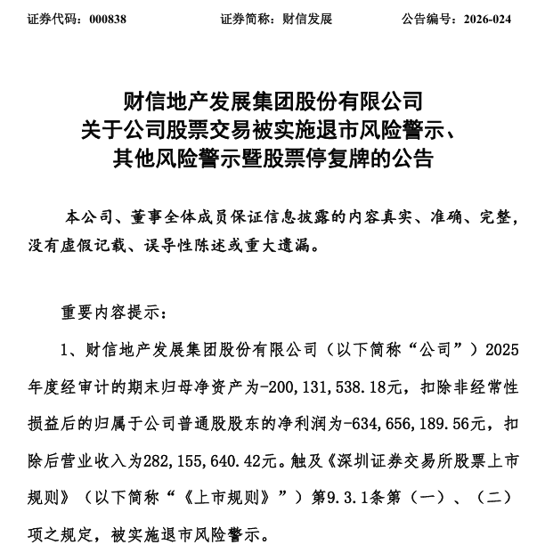 同日,财信发展(000838)公告称,公司2025年度经审计的期末归母净资产为-2.00亿元,归母净利润为-6.3亿元,扣非后净利润为-6.35亿元,扣除后营业收入为2.82亿元,触及《深圳证券交易所股票上市规则》第9.3.1条第(一)、(二) 项之规定,被实施退市风险警示。同时,因最近三个会计年度扣非前后净利润孰低者均为负值,且审计报告带持续经营重大不确定性段落,将被实施其他风险警示。