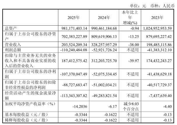 莫高股份(600543)4月23日晚间公告,公司2025年实现营业收入2.04亿元,同比下降38.00%;扣除与主营业务无关的业务收入和不具备商业实质的收入后的营业收入1.87亿元;归属于上市公司股东的净利润为亏损1.07亿元。