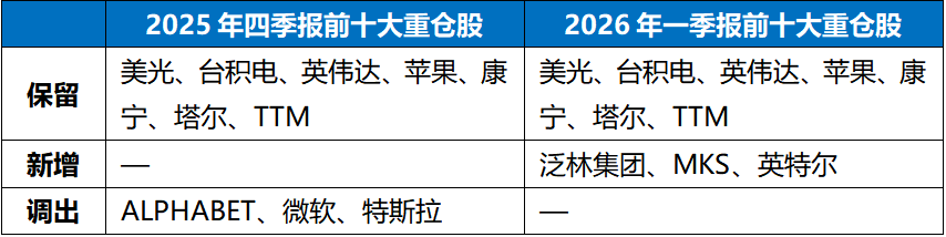 对比2025年四季报和2026年一季报,国富全球科技互联的前十大重仓股变化如下: