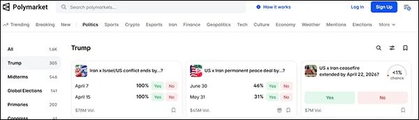 在特朗普政府的扶持下,线上预测市场迅速扩张。近期最大的一笔押注是特朗普对伊朗战事的态度,尤其是他本月5日在社媒上发布的要求伊朗“打开该死的海峡”的帖子。Dune称,5日至8日,Polymarket的交易量暴涨, 有关伊朗战争的交易数达4.13亿笔,投注金额超过1亿美元,而特朗普关于停火的帖子也再次激发了新的投注浪潮。