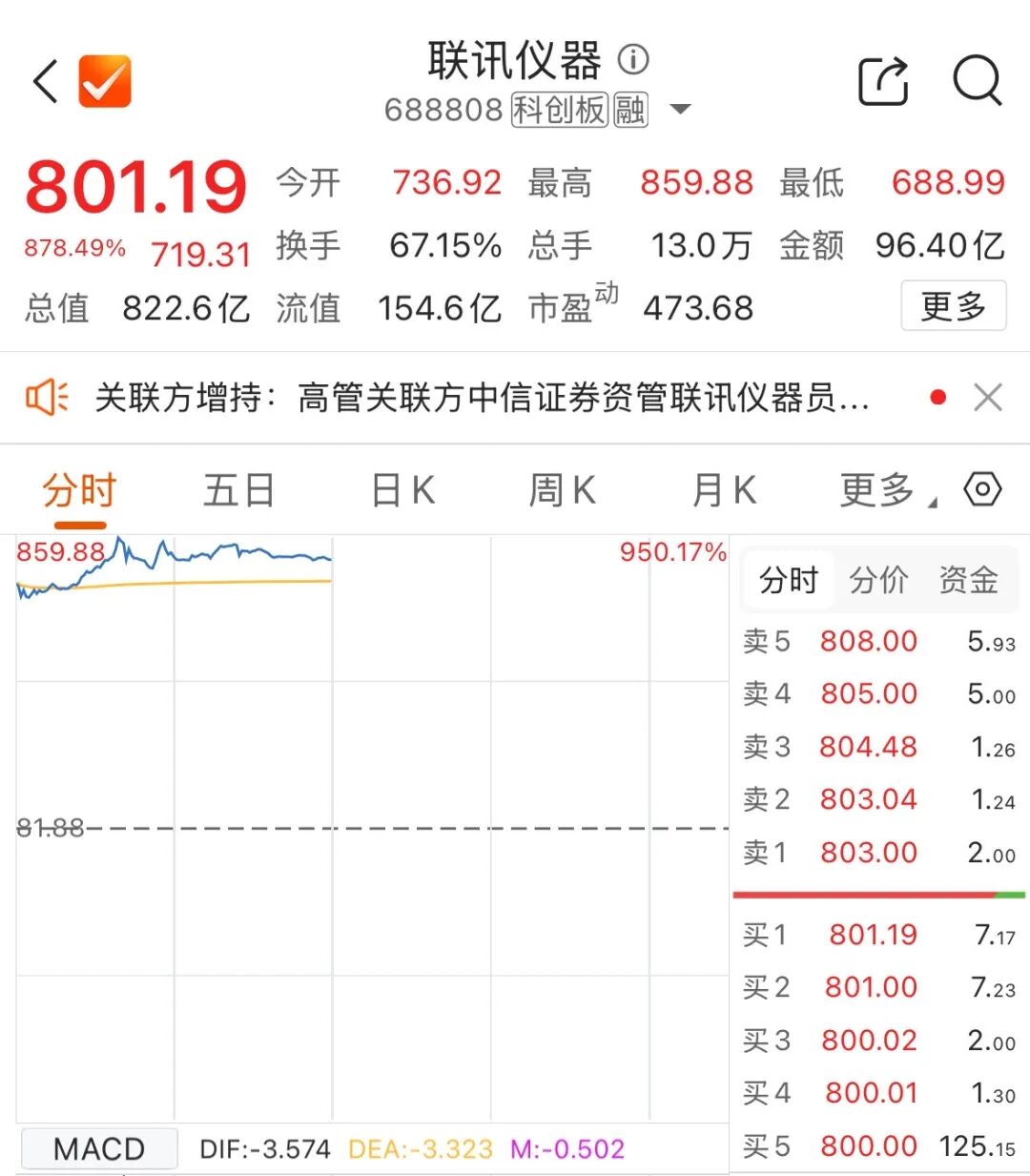 4月24日,N联讯正式登陆科创板,发行价81.88元/股,上市首日盘中一度大涨超950%,股价最高涨至859.88元/股。截至午间收盘,N联讯报801.19元/股,涨878.49%,成交额96.4亿元,换手率达67.15%,总市值822.6亿元。