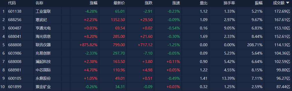 个股方面,工业富联全天成交额超172亿元位居沪深两市第一,寒武纪、亨通光电、海光信息等个股成交额居前。
