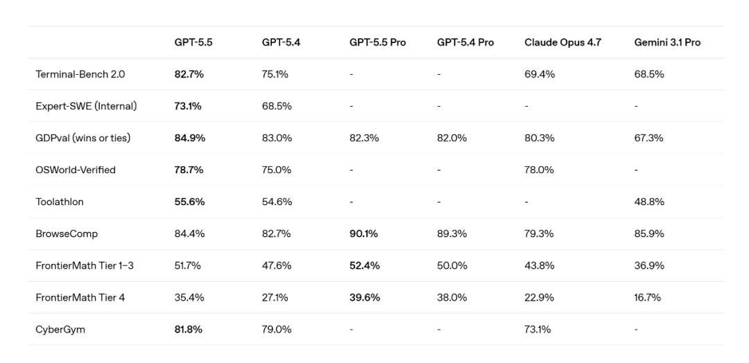 从基准测试数据来看,GPT-5.5在几乎所有核心指标上都超越了前代GPT-5.4。