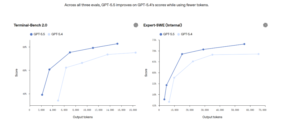 上图显示,GPT-5.5在Terminal-Bench 2.0得分82.7%,比GPT-5.4的75.1%有明显提升;衡量长周期真实工程任务的内部评测Expert-SWE从68.5%升至73.1%。