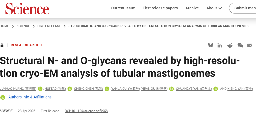 深圳医学科学院颜宁团队联合清华大学团队,在《科学》发表糖质结构研究重磅成果。团队搭建高分辨率冷冻电镜、糖蛋白质组学与AI建模融合研究体系,获得约2Å整体分辨率、核心局部1.8Å的超高分辨率三维电镜密度图,将天然糖质复合物研究推进至近原子分辨率层面。
