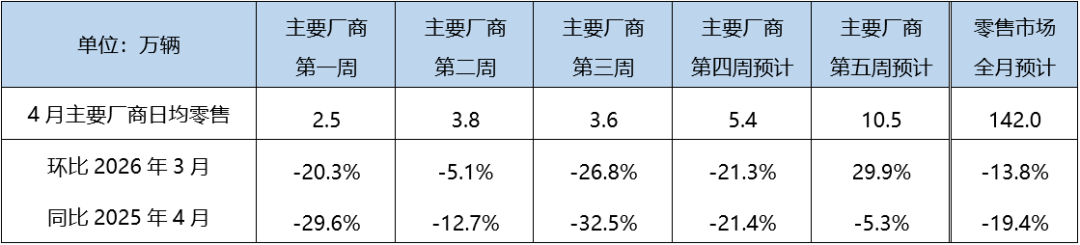 4月各地促消费政策持续显效,春季新款车型集中上市亮相,终端客流温和恢复。虽然前期政策调整带来短期增速波动,但市场内在增长动能逐步接续,预计4月下旬起市场将回归平稳运行轨道。