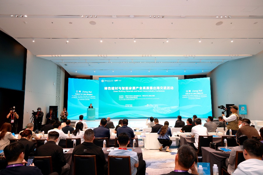 中国五矿化工进出口商会会长江辉在致辞中表示,全球绿色低碳转型与智能技术正深刻重塑行业格局。我国绿色建材与智能家居已形成完整高效的供应链,产品成为高品质、绿色智能的代名词。活动以务实对接为特色,旨在为好产品找到好伙伴,助力企业从“走出去”迈向“走得更稳、走得更远”。