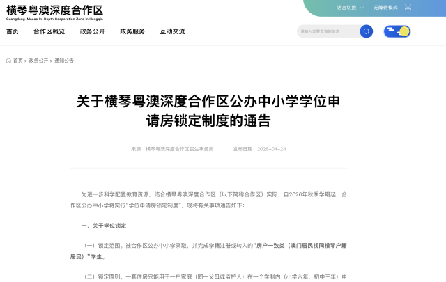 为进一步科学配置教育资源,结合横琴粤澳深度合作区(以下简称合作区)实际,自2026年秋季学期起,合作区公办中小学将实行“学位申请房锁定制度”。现将有关事项通告如下: