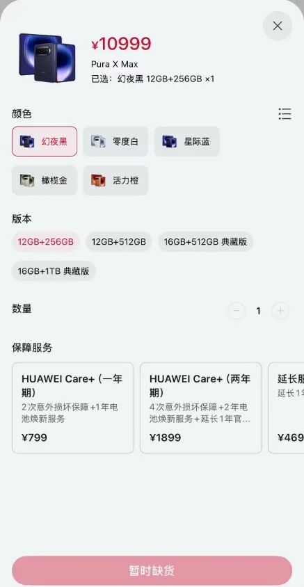 华为商城显示,华为Pura X Max开售即售罄,各个版本均已断货。