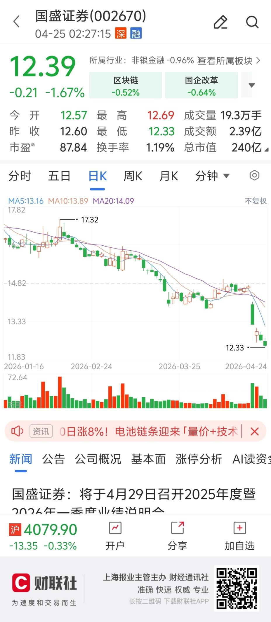 业绩下挫券商股则大幅下跌,业绩大跌的国盛证券,股价在公布业绩的次日即4月21日封跌停板;国元证券在业绩公布的次日,即4月21日收跌5.97%。
