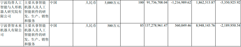 这两家主要从事智能机器人生产、销售和服务的公司,期末总资产合计达到 2.29 亿元,净资产合计为 -65.69 万元。这意味着,上述两家公司可能已经完成重资产的投入,而资金完全依赖于母公司的资本金注入和借款。