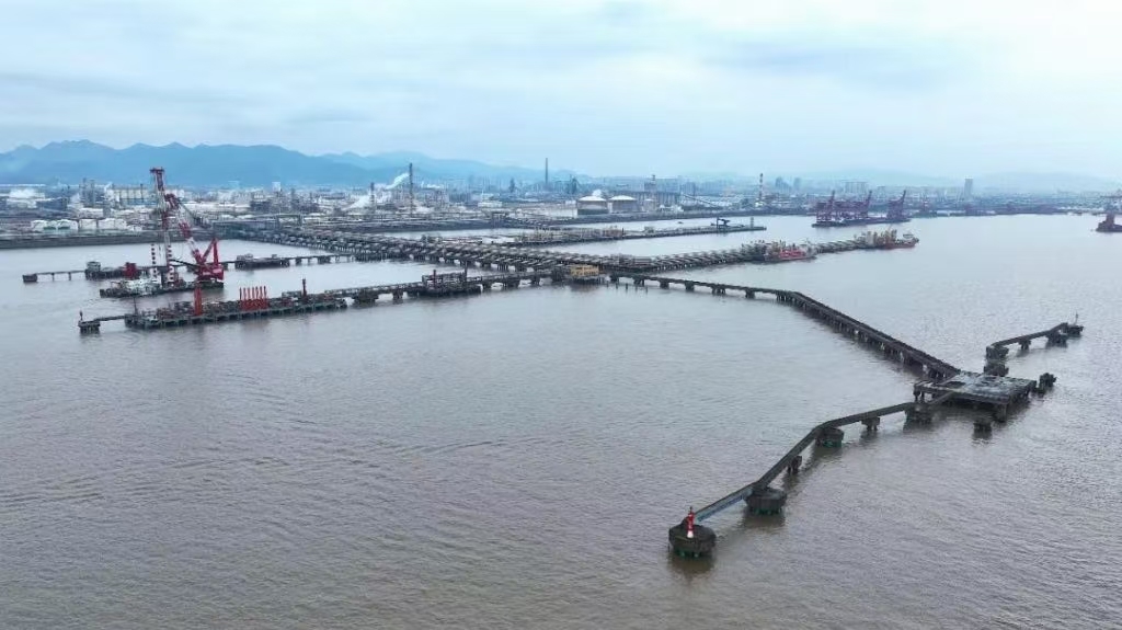 一季度,浙江100个强港重点项目完成投资196亿元,为年度计划的32%,进度快于时序。图为宁波舟山港北仑港区协和码头建设项目二期工程现场。 “浙江海洋经济” 供图