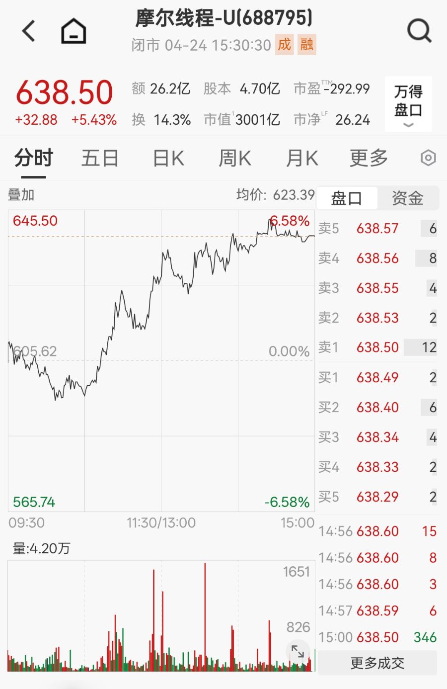 股价方面,4月24日,摩尔线程报638.5元/股,涨5.43%,4月以来股价涨超14%。