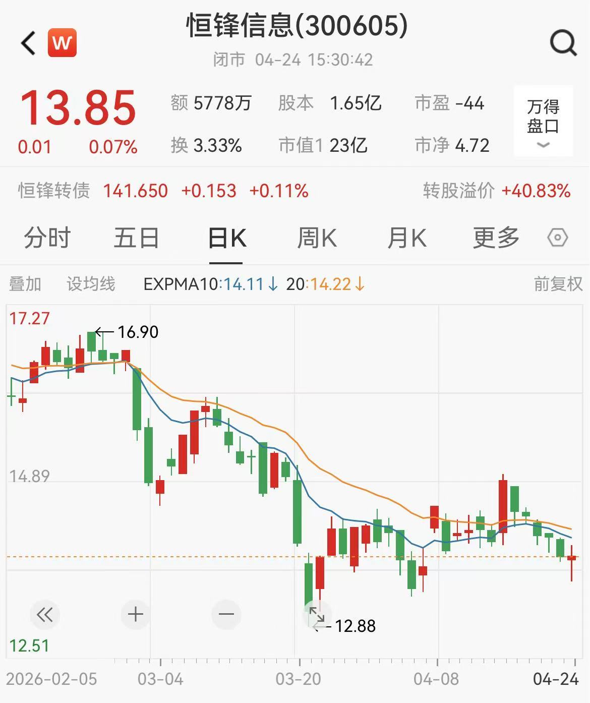 大股东频繁减持叠加业绩持续亏损,公司二级市场表现疲弱。截至4月24日收盘,恒锋信息报13.85元/股,年内累计跌幅超过11%。