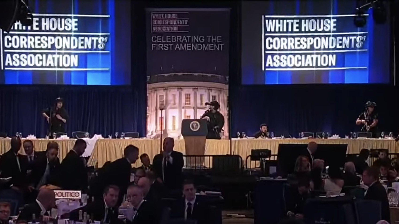 当地时间4月25日,有消息称美国华盛顿希尔顿酒店内传出“枪声”后,美国总统唐纳德·特朗普紧急撤离了白宫记者晚宴现场。