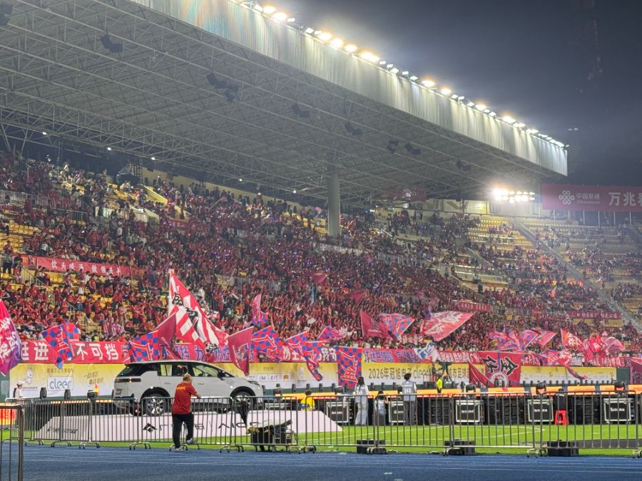 整场比赛气氛热烈,球迷助威声不断,30面主场队旗、10面助威横幅,搭配1500面球迷方阵旗海、5000面围巾墙,营造了浓厚主场氛围;在主席台对面还设置了主客场球衣巨幅TIFO展示,全场13000个数控灯助威棒同步闪烁。