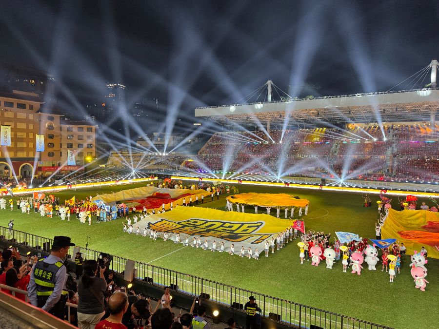 这场揭幕战所在的越秀山体育场,始建于1926年,见证了南派足球近一个世纪的沉浮。时隔百年,“粤超”在此开幕。开幕式设置了“光影里的南粤足印”墙体秀,梳理新中国成立后广东足球的6大历史节点;容志行、池明华、彭伟国、郜林等广东足球名宿完成了一场跨越代际的足球交接仪式。