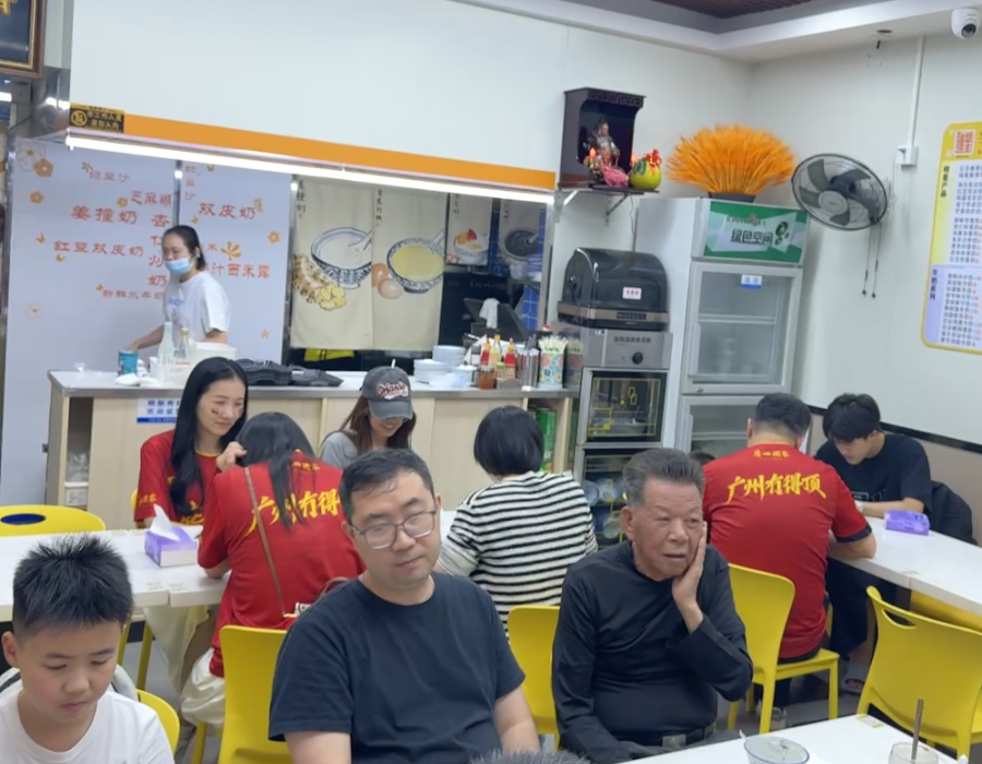 比赛结束后,越秀山体育场外的糖水铺里坐满了看完比赛的球迷。老板在门外支起临时桌椅,不少产品已经售罄。