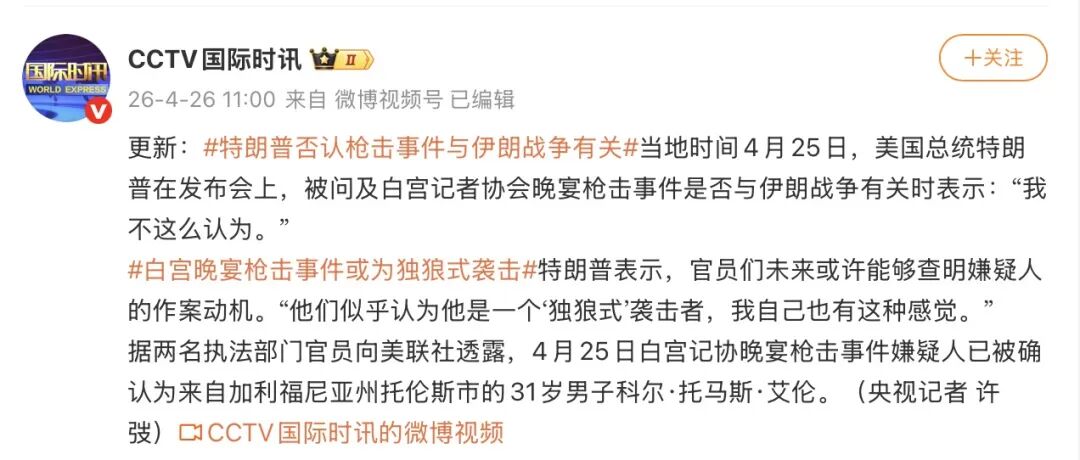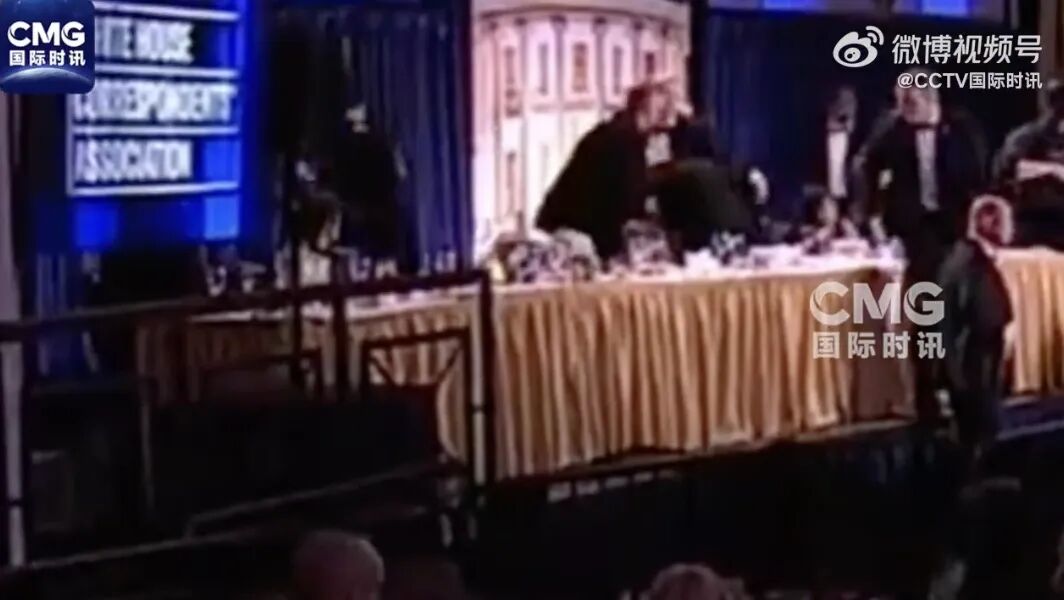 特朗普在回答记者提问时表示,当天发生在白宫记者协会晚宴上的突发事件“完全令人震惊”,他听到一声响动,但是以为是托盘掉在地上了。“我当时正在观察情况,”但是他的妻子躲避得更快,似乎很快就意识到发生了什么事。(视频截图/图源:@CCTV国际时讯)
