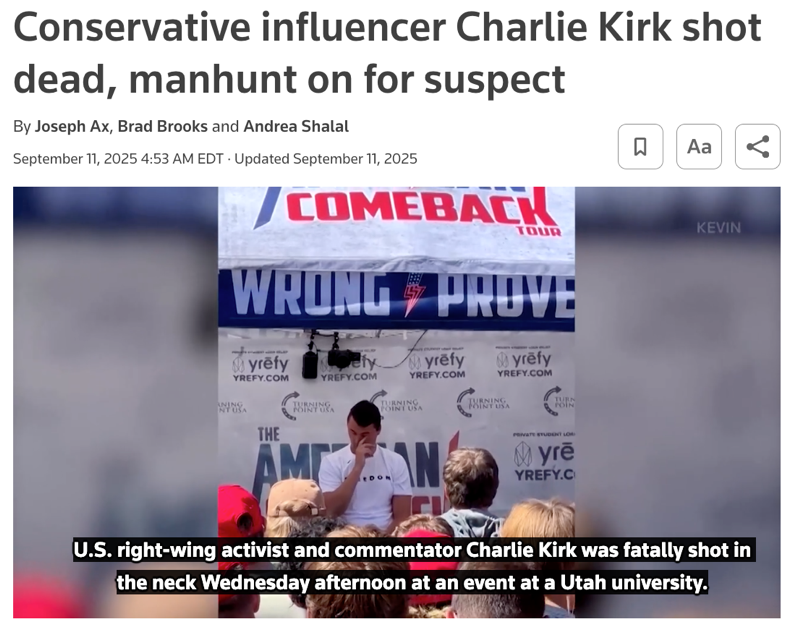 △路透社报道,查理·柯克遇刺事件只是一系列美国政治人物遇袭事件中的最新一起,美国正经历20世纪70年代以来持续时间最长的政治暴力时期