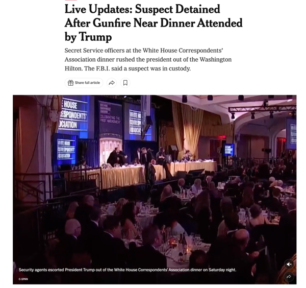 △《纽约时报》报道,白宫记者协会晚宴期间发生枪击事件,之后,一名嫌疑人被拘留
