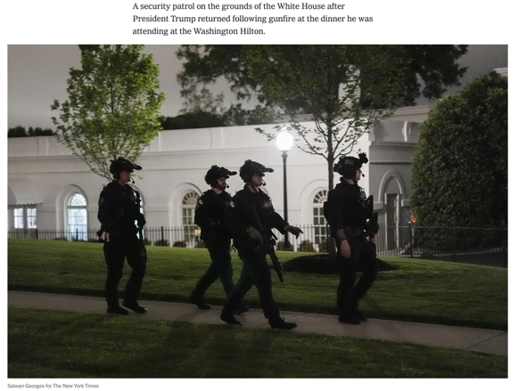 △《纽约时报》报道,当晚枪击事件发生后,安保人员在白宫附近进行安全巡逻