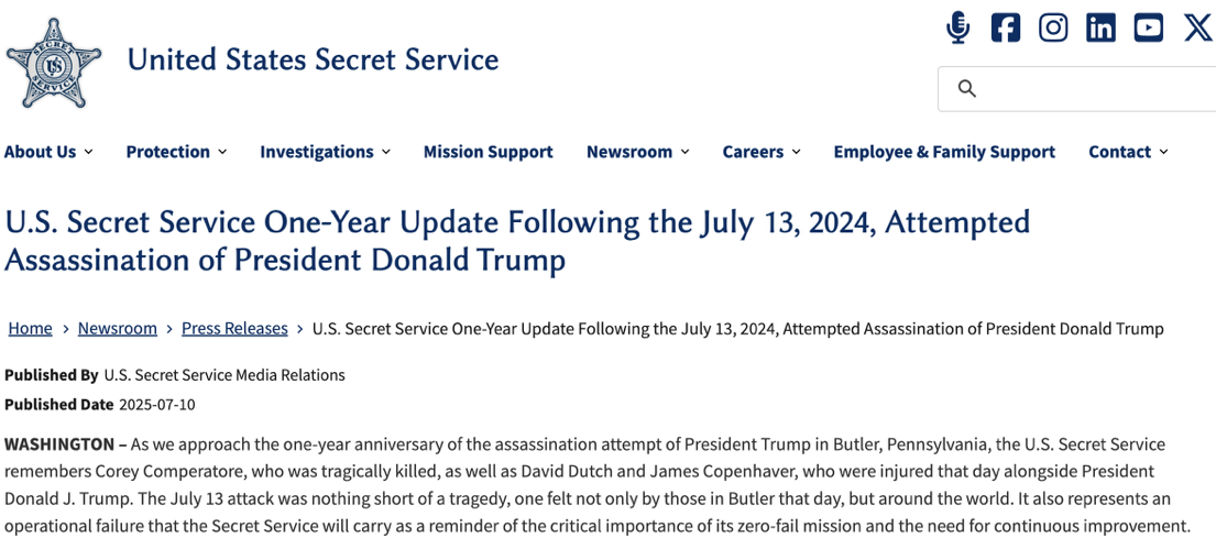 △美国特勤局在特朗普遭遇刺杀一周年时发布报告,称此事件说明了特勤局的失误,特勤局随后进行了安保方面的多项改革