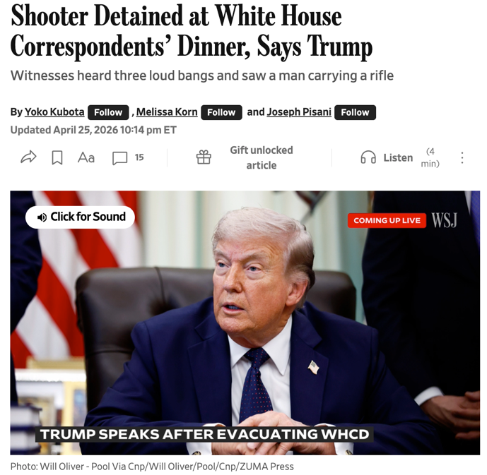 △《华尔街日报》报道,特朗普总统原本计划在白宫记者晚宴发表讲话,这是他2015年以来首次出席该活动,枪击事件后,晚宴不得不改期