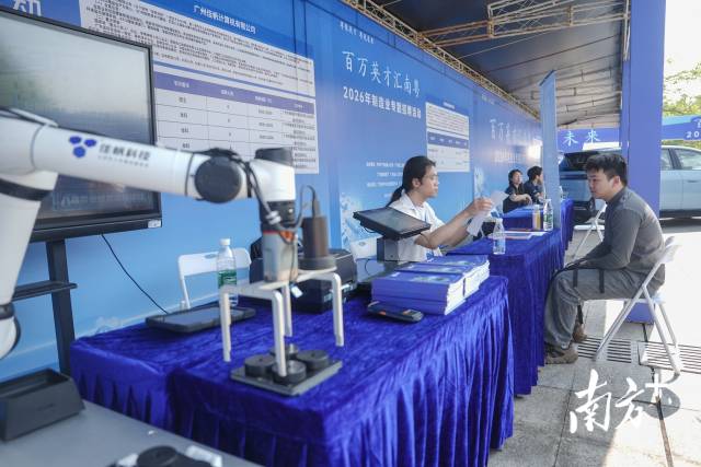 除了高效的供需对接,现场浓厚的科技氛围也成为了一大亮点。招聘会特设了工业企业产品现场展示专区,不少行业龙头企业带来了工业机器人、智能机器狗、无人机等先进智能装备。实物陈列与现场演示不仅增强了互动性,更让求职者直观感受到了广东制造业的硬核实力。
