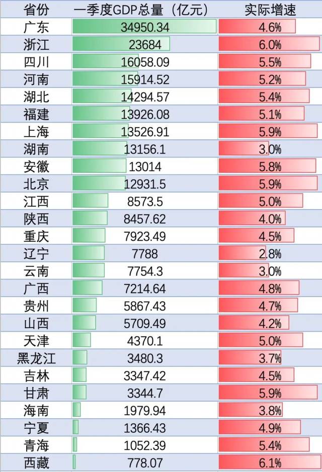 已公布数据的省份中,西藏以6.1%的增速暂居首位,浙江、北京、上海、甘肃紧随其后,而广东的经济总量则暂时领跑全国第一。