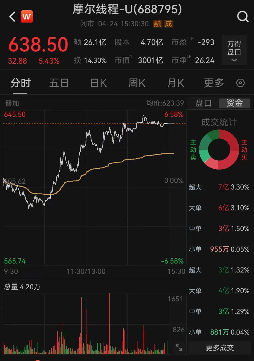 截至24日收盘,摩尔线程涨5.43%,每股报638.5元,市值3001亿元。