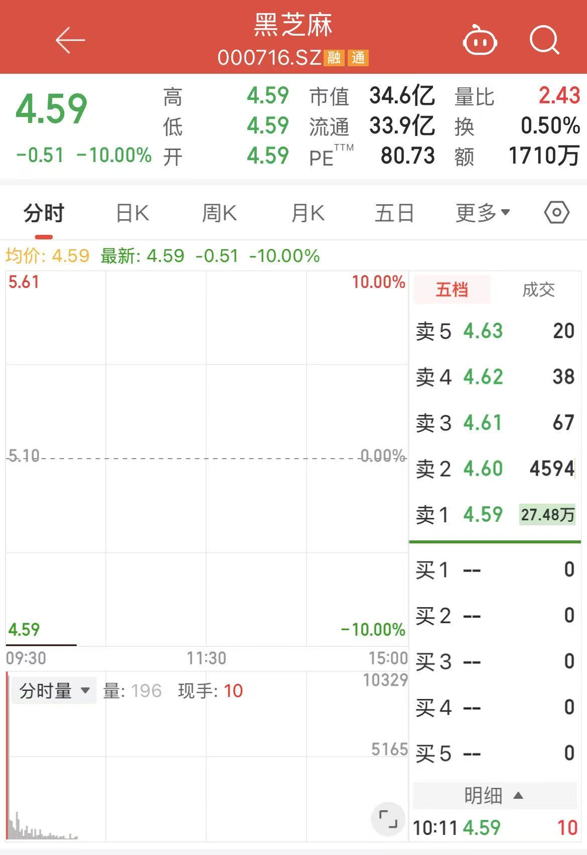 4月27日,黑芝麻(000716.SZ)开盘即一字跌停,截至10时12分,报4.59元/股,跌幅达10%,跌停板上封单超20万手。
